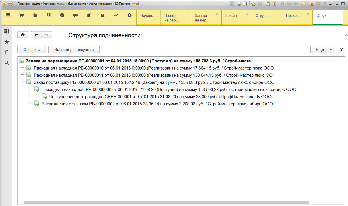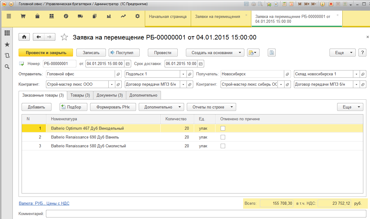 "Заявка на перемещение", заказанные товары |